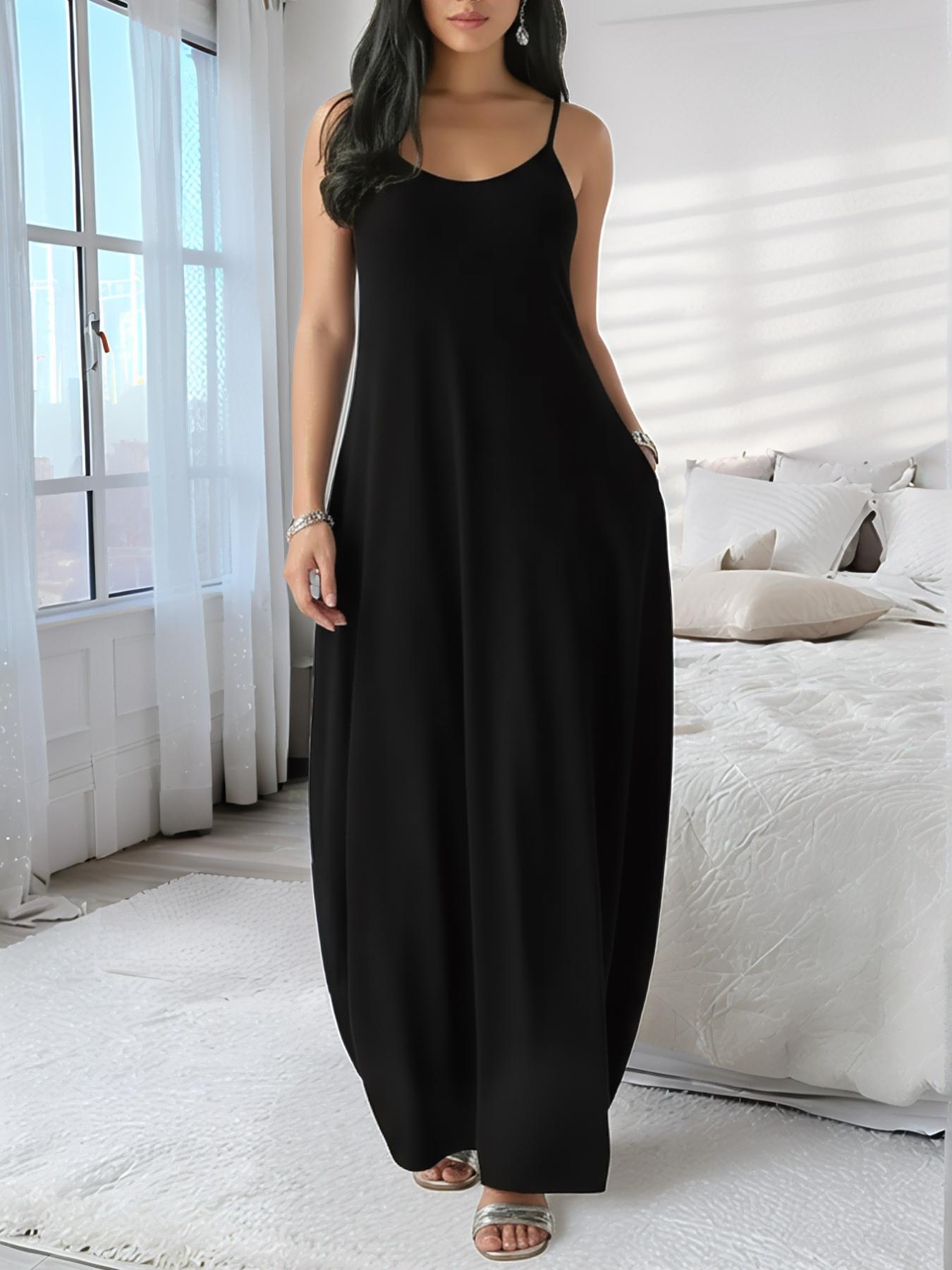 Chic Women's Long Leopard Print Coffee Dress - Comfortable Round Neck Sleeveless Pocket Sleepwear for All Seasons